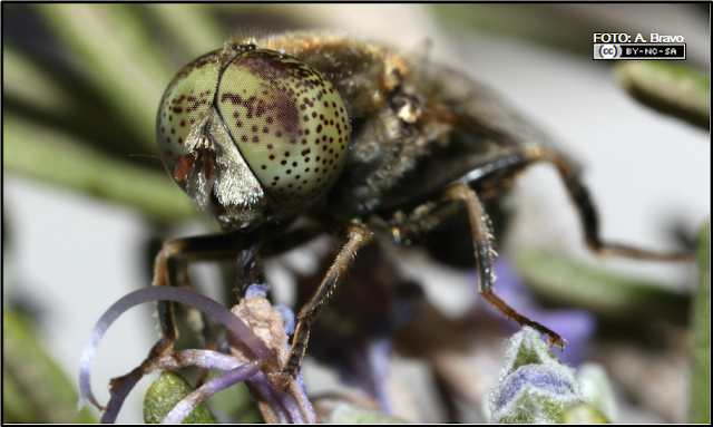 | Detalles de los ojos holópticos del Eristalinus aeneus sobre flor de romero. (fijarse que ambos ojos se unen en algún punto sobre la cabeza. típico de los machos). Observar igualmente el curioso mecanismo de filamentos de semianteras de la flor del Rosmarinus officinalis... todo un ingenio de la coevolución entre especies insecto y planta. |